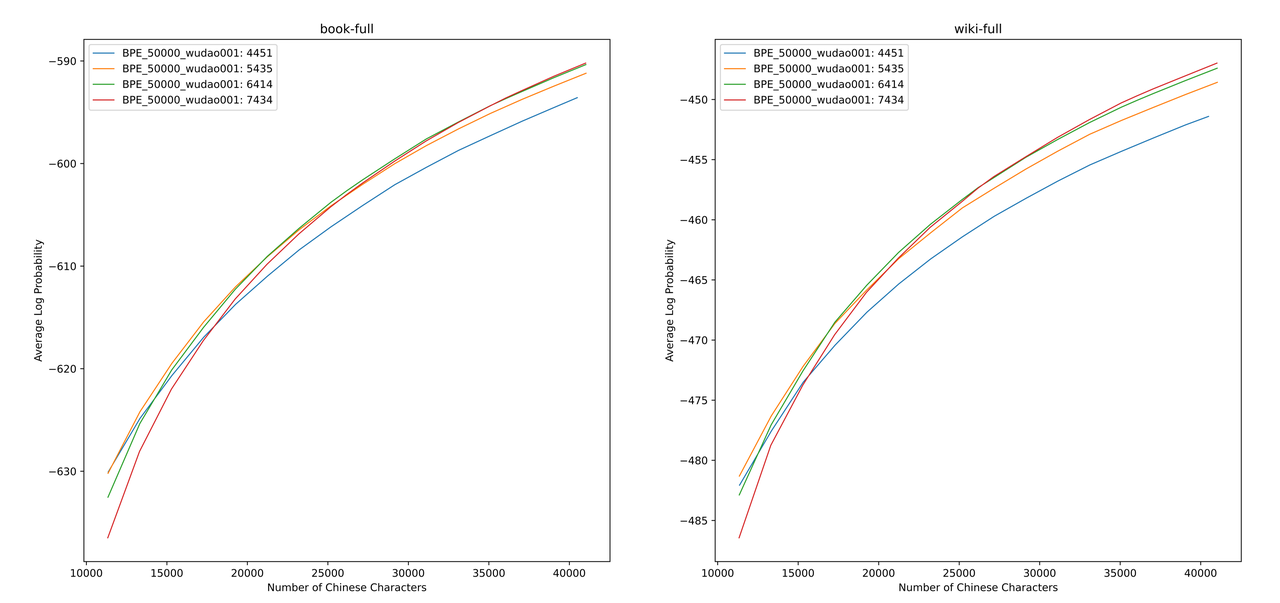 ๆไปฌไฝฟ็จsentencepieceๅจ12G็ฅไนๆฐๆฎๅ2Gๆ้ๆฐๆฎไธ่ฎญ็ปไธญๆBPE่ฏ่กจใๆไปฌๅจ่ฎญ็ป่ฏ่กจๆถๅๅซๆไธพไบไธญๆๅๅญTokenๆฐ้ไปฅๅไธญๆๆปTokenๆฐ้๏ผๅนถๅฏนไบ่