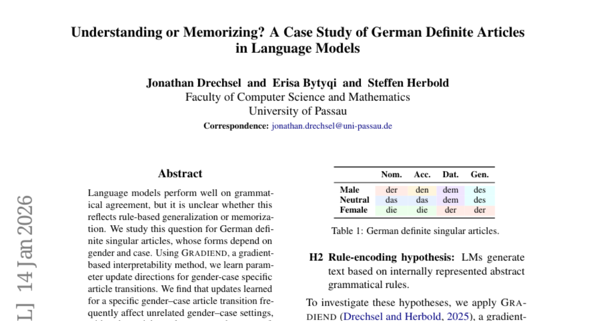 Understanding or Memorizing? A Case Study of German Definite Articles in Language Models